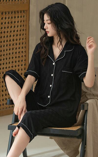 【急速出荷】[激安]ルームウェア パジャマ レディース 半袖 五分袖 七分丈 ズボン 前開き 春夏秋 綿95 ふんわり 柔らかい ナイトウェア 上下セット 部屋着 ブラック ベージュ ピンク パープル