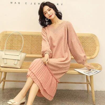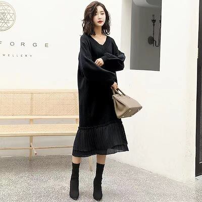 【2枚購入で4oo円OFF!】ニットワンピース ニット ワンピース レディース 秋 冬 vネック 無地 長袖 厚手 ゆったり 切り替え プリーツ ロング丈 ロングワンピース Aライン