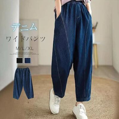 デニム ワイドパンツ レディース デニムパンツ 無地 ガウチョパンツ ジーンズ ゆったり ボトムス ジーパン バギーパンツ ウエストゴム 森ガール ズボン 体型カバー 美脚 カジュアル リラックス ブ