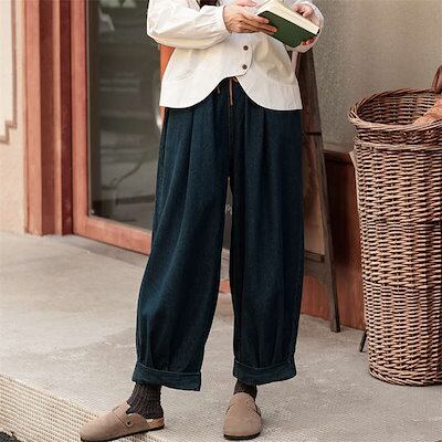 デニムパンツ レディース イージーワイドパンツ ボトムス パンツ ウエストゴム ゆったり 美脚 レトロ リラックス 秋 冬 無地 ガウチョ ポケット付 サルエルパンツ バルーン カジュアル 体型カバ