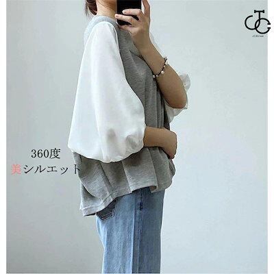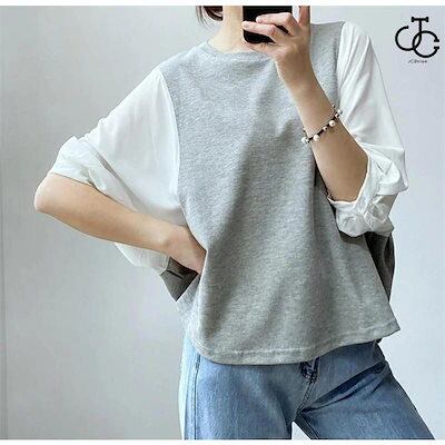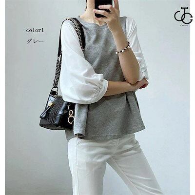 tシャツ 七分袖 レディース ブラウス 切替 ゆったり ボリューム袖 バルーン袖 ドッキング 重ね着 ドルマンスリーブ とろみ チェック柄 無地 春夏 トップス 春夏