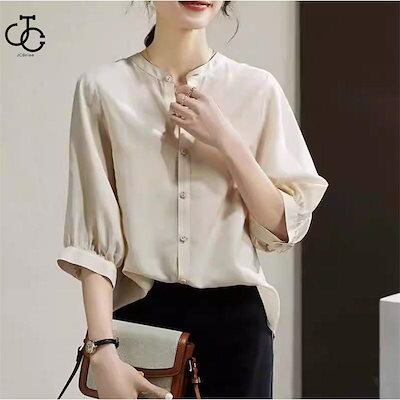 ブラウス 半袖 レディース シフォン 開襟シャツ 7分袖 無地 tシャツ トップス ゆったり オフィス 通勤 涼しい 薄手 おしゃれ カジュアル
