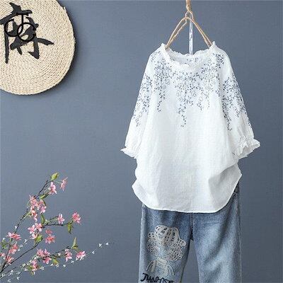 チュニック 春 ブラウス シャツ 半袖 レディース プルオーバー ブラウス ロングシャツ 夏 刺繍 お洒落 大きいサイズ 40代 50代 夏 ゆったり 花柄 可愛い