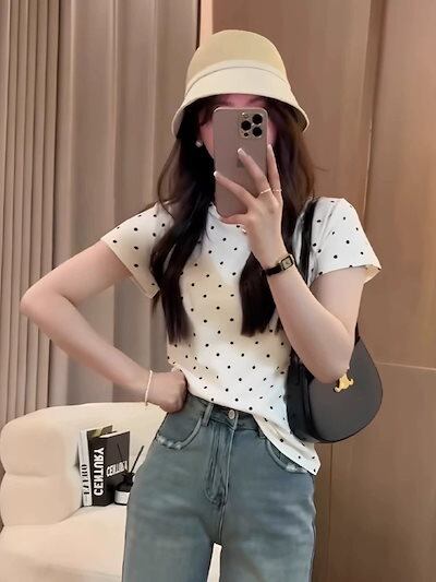 グレー水玉半袖Tシャツ 夏の新作 韓国版 カジュアルトップス Tシャツ ティーシャツ ロングTシャツ トップス 半袖 tシャツ レディース レディースファッション tシャツ 韓国