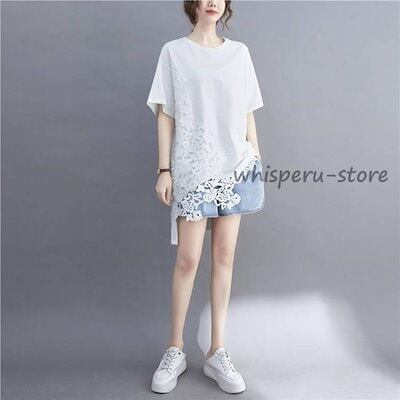 半袖tシャツ レディース 夏 アシンメトリー 半袖tシャツ ロング レディース カットソー 半袖 レース 夏 チュニック レディース 切り替え