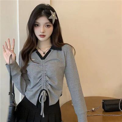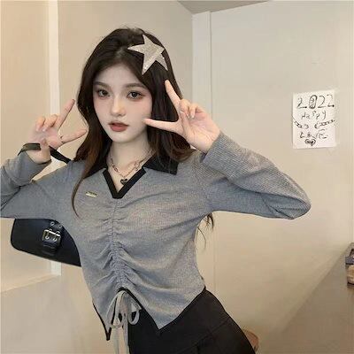 人気新作vネック ポロシャツ スリミング 長袖Tシャツ レディース 春 外着 ショット丈 トップス ギャル