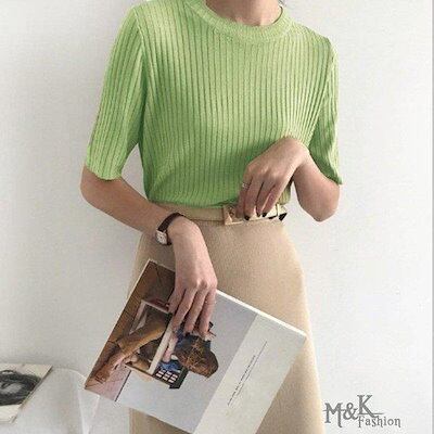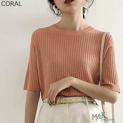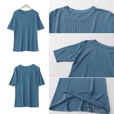 リブ ニットトップス レディース ラウンドネック サマーニット 半袖 カットソー おしゃれ プルオーバー 着やせ