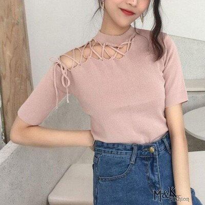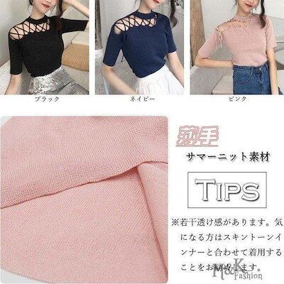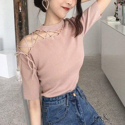 半袖 ニット トップス レディース 春ニット サマーニット レースアップ ニット 薄手