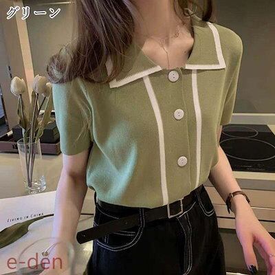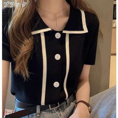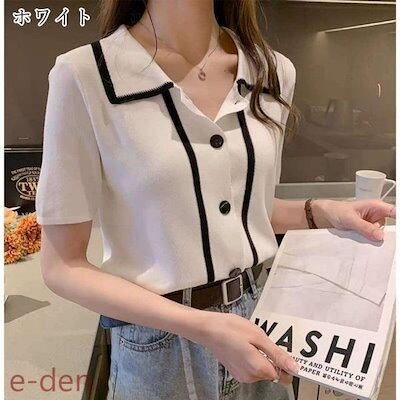 ニットブラウス サマーニット レディース 女性 トップス 半袖 角襟 前ボタン 前開き ライン ホワイト ブラック シンプル かわいい キュート カジ