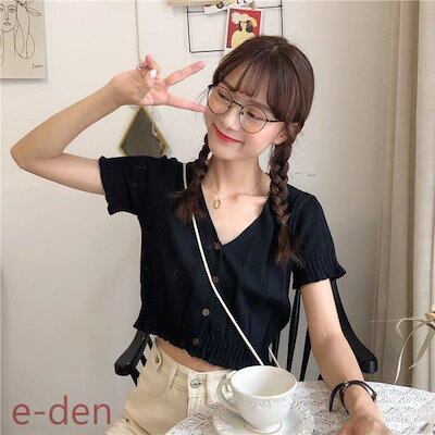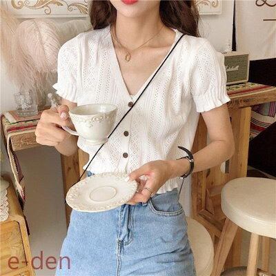 ニットトップス サマーニット ニットブラウス レディース 女性 カーディガン 半袖 Vネック 前ボタン 前開き ショート丈 ブラック オフホワイト シ