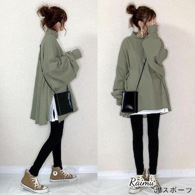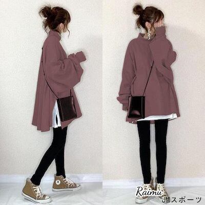 ブラウス パーカー レディース 長袖 トップス 韓国風 ゆったり ハイネック 偽二枚 無地 スリット 体型カバー スリム 着痩せ おしゃれ お出かけ カジュアル
