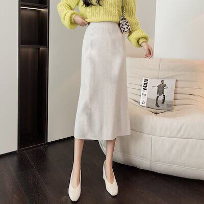ニットスカート レディース 無地 韓国ファッション ウエストゴム タイトスカート スリット入り ペン