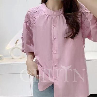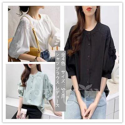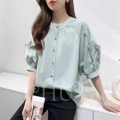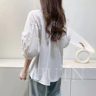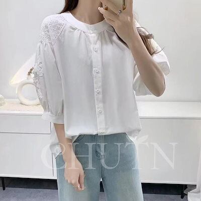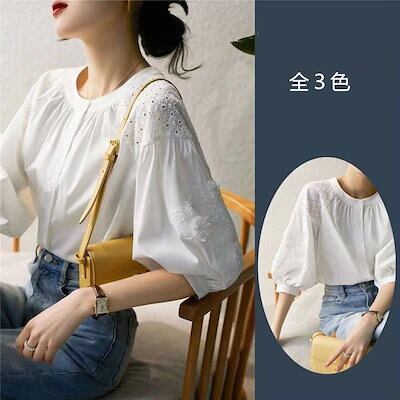 半袖 ジャガードブラウス レースブラウス白 レディース 春秋 新作登場 インナーコーデ トップス スカラップ ラウンドネック 花柄 パフスリーブ 気質 キレイめ フランス風