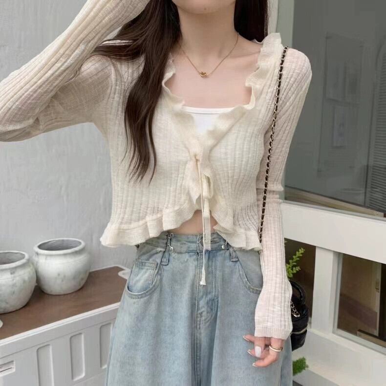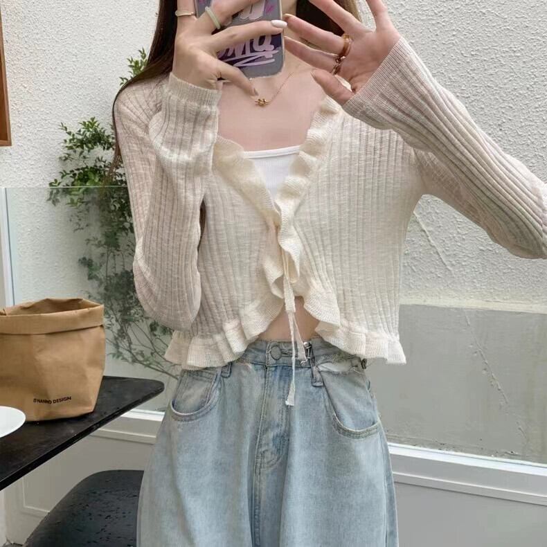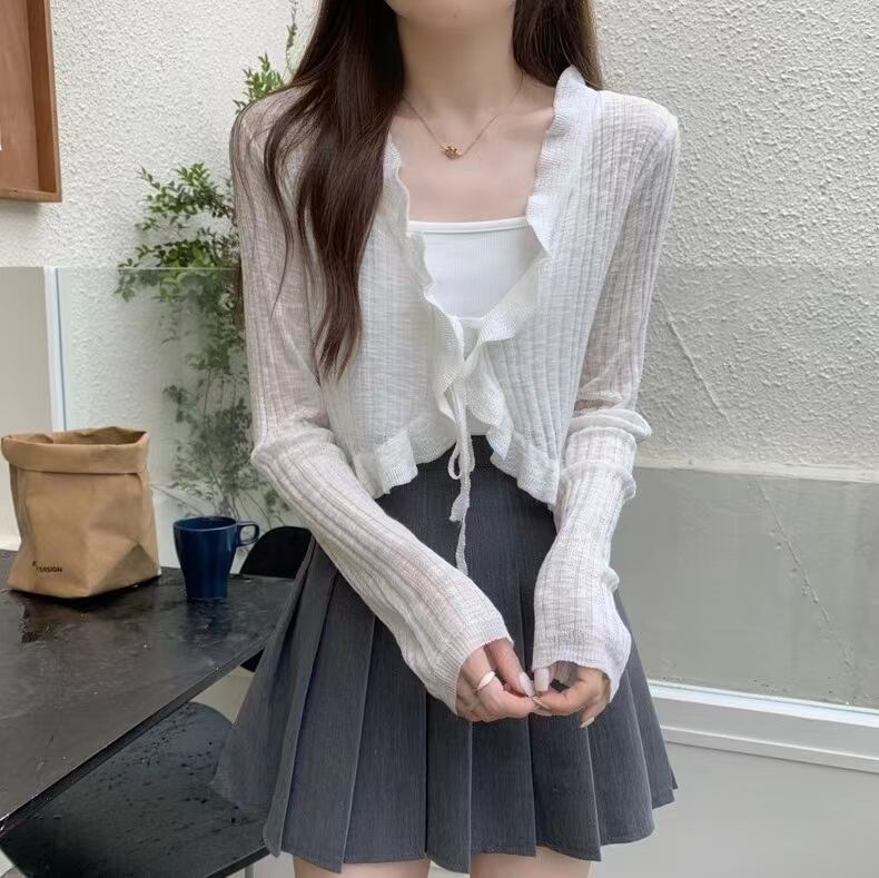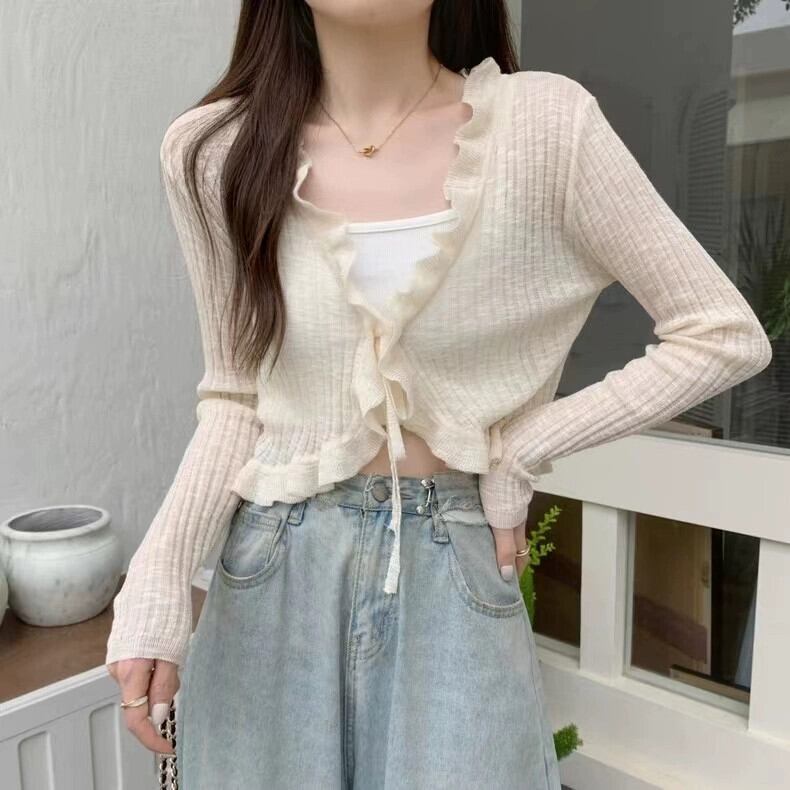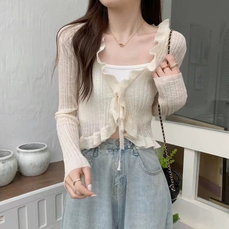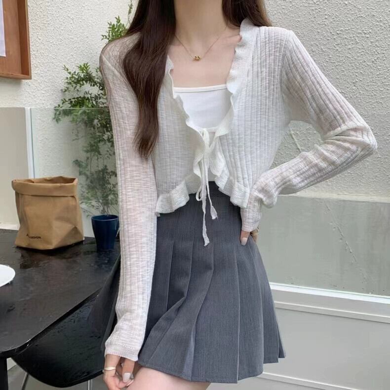春と秋の薄いアイスシルクニットカーディガン長袖夏黒アウターショート空調シャツ日焼け防止ショールトップ女性 ロング ブラック スプリング 春物 サマー 夏物 オータム 秋物 トップス シャツ takotakoo0223b88241160541