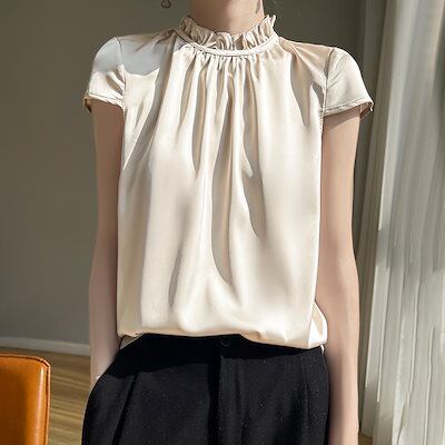 シフォンブラウス 【上品】夏 無地 サテンブラウス レディース 高級感 垂れ感半袖トップス 韓国ファッション ??感 木耳縁襟 アイスシルク 半袖 Tシャツ 上品 大人 通勤 20代 30代 40代