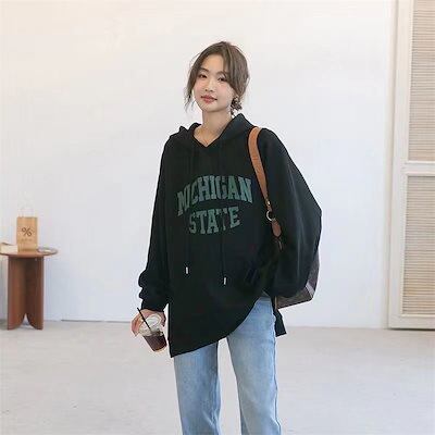 秋 高級感 スリット スウェット 韓国ファッション 大きいサイズ ゆったり パーカー レディース カジュアル 百掛け 体型カバー?長袖スウェットフード付き 秋トレーナー