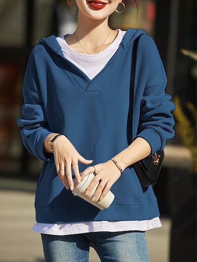 秋 大きいサイズ ゆったりパーカー レディース 韓国ファッション フェイクレイヤード フード付きパーカー 百掛け体型カバー?薄 長袖スウェット 無地 秋冬 長袖トップス