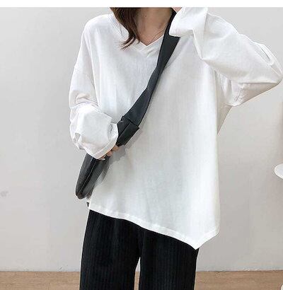 秋新入荷 大きいサイズ イレギュラーVネック長袖トップス ゆったり百掛け 長袖tシャツ レディース 着痩せカジュアル 怠惰な風 無地スウェットTシャツ 初秋薄 アンダーウェアインナー
