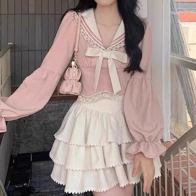 韓国ファッション 百掛け 春 アカデミック 長袖 リボンの上着 やせて見える ポンポンスカート セット