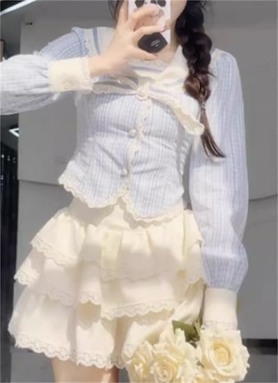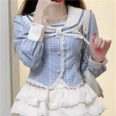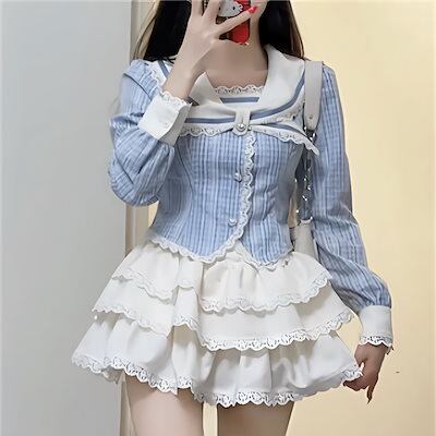 韓国ファッション 百掛け かわいい 海軍領 青 上着 やせて見える A字半身スカート