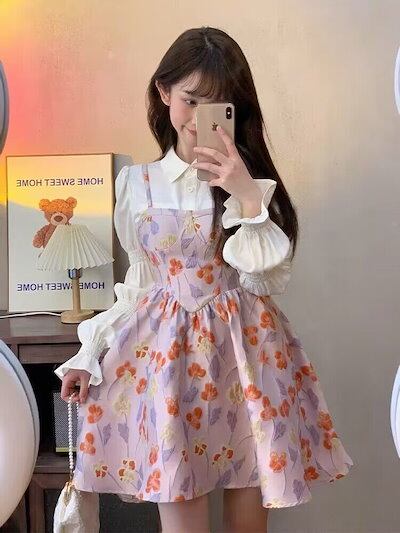 ワンピース 百掛け バブルスリーブ 白い長袖シャツ ポンポンスカート やせて見える ストラップワンピース 韓国ファッション