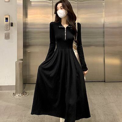 ワンピース 百掛け ブラック 長袖ワンピース 秋 やせて見える ミディアムスカート 韓国ファッション