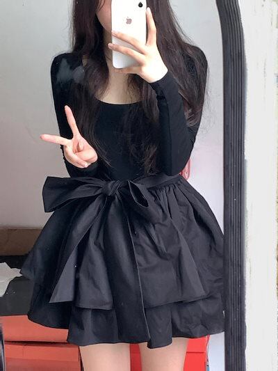 ワンピース 百掛け 秋 フレンチワンピース 黒スカート ポンポン姫スカート 韓国ファッション
