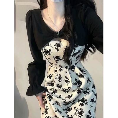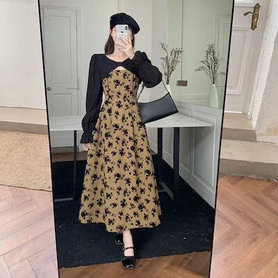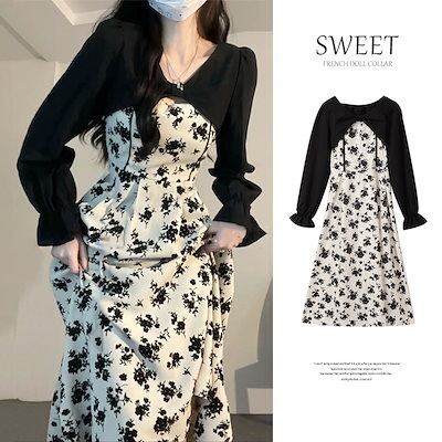 ワンピース 百掛け フランス 花柄ワンピース 秋 ロングスカート 韓国ファッション