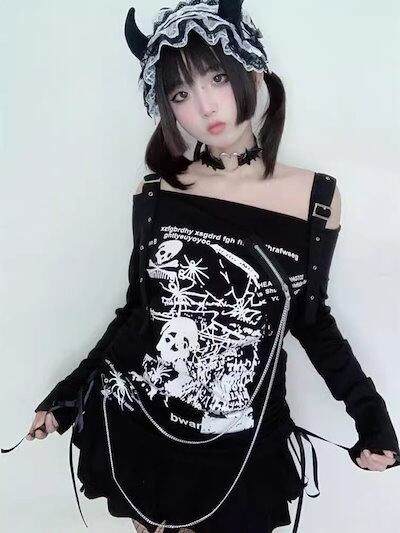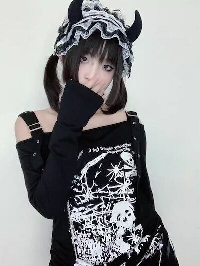 ギャルゴシックパンクトップス肩出しプリント長袖ドローコードゆったりTシャツ