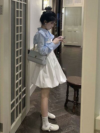 韓国ファッション 百掛け 秋 セット やせて見える フライングスリーブシャツ 白 キャミソールスカート ポンポンスカート