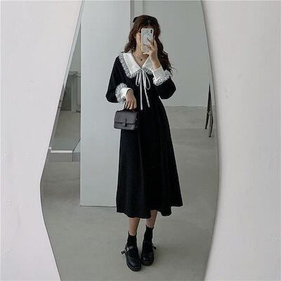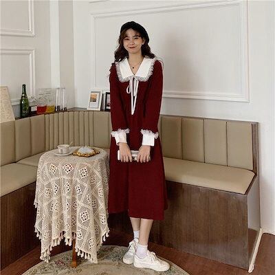 韓国ファッション 百掛け Vネック レース本 ベビーカラー やせて見える フランス ロングワンピース