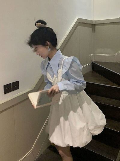 韓国ファッション 百掛け 秋 セット やせて見える フライングスリーブシャツ 白 キャミソールスカート ポンポンスカート