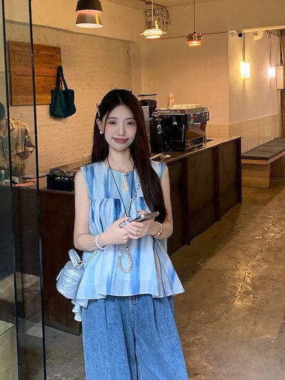2024 春夏トップス シャツ ノースリーブ ラウンドネック ゆったり 細見え 夏 青 水色 ブルー 爽やか おしゃれ かわいい 韓国ファッション レディース お出かけ