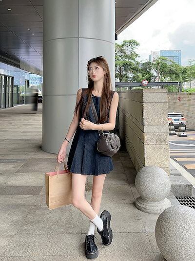 2024 春夏ワンピース ノースリーブ ラウンドネック ミニ丈 Aライン レトロ デニム生地 プリーツ 細見え 夏 おしゃれ かわいい 甘め キュート ラブリー 韓国ファッション レディース お出かけ