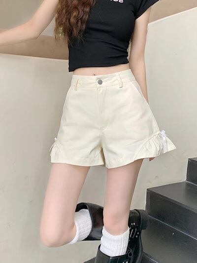 2024 春夏パンツ ショート丈 ワイド ハイウエスト 美脚効果 脚長効果 細見え 短パン 黒コーデ フレンチ おしゃれ かわいい 韓国ファッション系 レディース 女子お出かけ型