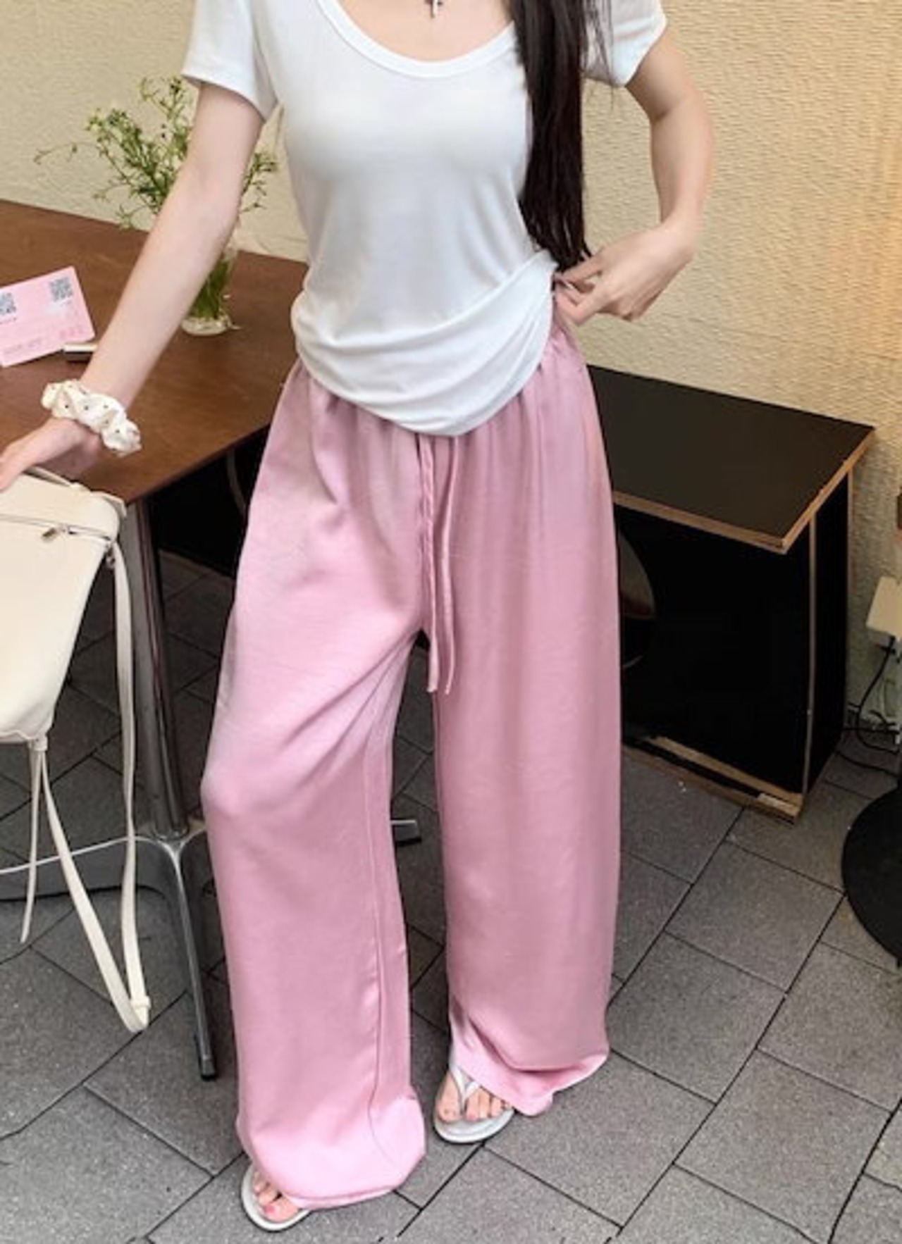 2024 春夏パンツ ロング丈 ウエストゴム ワイド ストレート ハイウエスト 美脚効果 脚長効果 細見え 夏 白 黒 おしゃれ かわいい 韓国ファッション レディース お出かけ