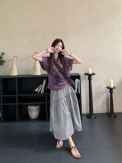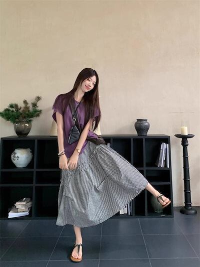 2024 春夏スカート ミモレ丈 フレア Aライン ギンガムチェック 黒 ブラック ハイウエスト 美脚効果 脚長効果 細見え 夏 おしゃれ かわいい 韓国ファッション レディース お出かけ