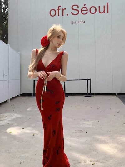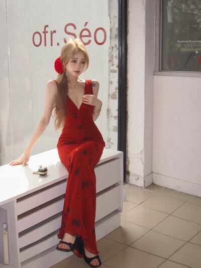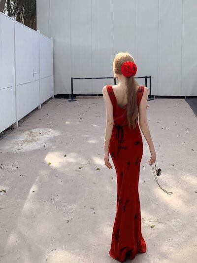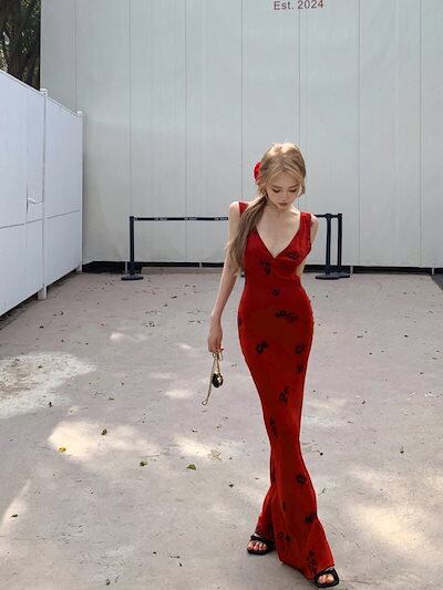 2024春夏 ワンピース ロング丈 ゆったり Vネック キャミソール ハイウエスト かわいい カジュアル おしゃれ 夏 ファッション フィッシュテールフレンチお出かけ