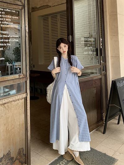 2024 春夏ワンピース シャツ ギンガムチェック柄 ラウンドネック 半袖 ボタン ミモレ丈 Aライン ゆったり 細見え 夏 青 ブルー カジュアル おしゃれ かわいい 韓国ファッション レディース