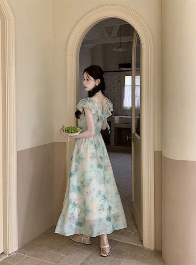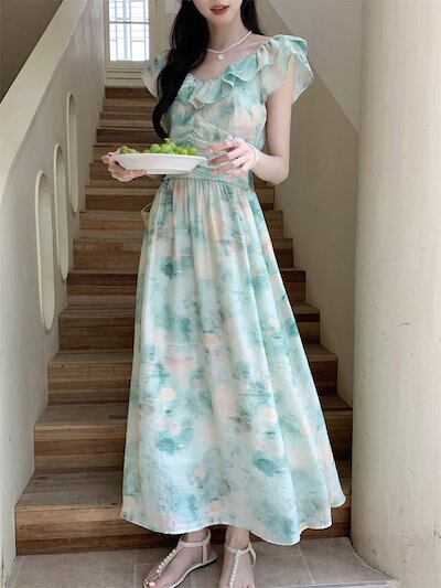 2024夏 韓国ワンピース 半袖 Vネック ミモレ丈 花柄 Aライン ゆったり 細見え 夏 緑 グリーン おしゃれ かわいい 韓国ファッション レディース お出かけ