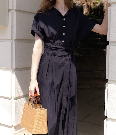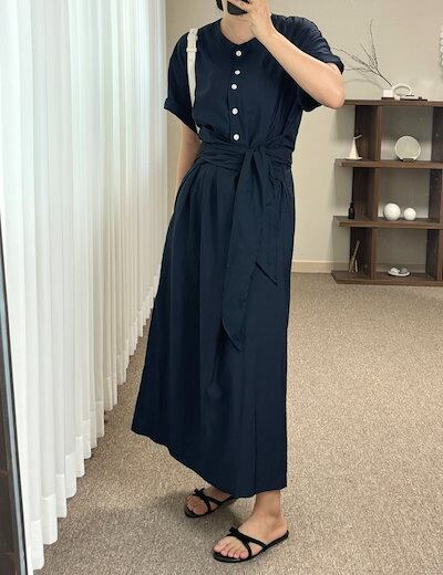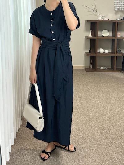 2024 夏 韓国ワンピース ロング丈 ラウンドネック ボタン 半袖 Aライン リボン ベルト ゆったり 細見え 夏 白 きれいめ おしゃれ かわいい キュート 韓国ファッション レディース お出かけ