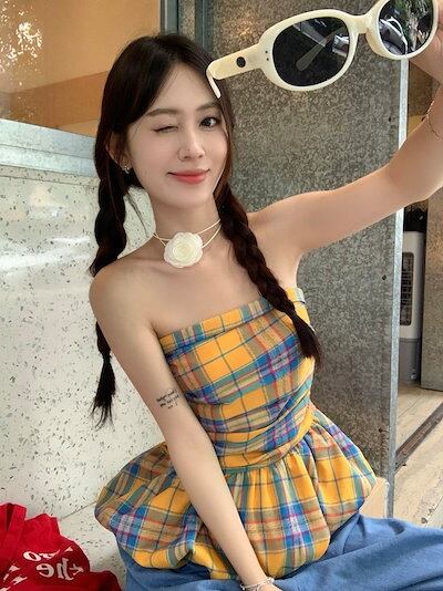 2024夏 韓国トップス シャツ チェック ノースリーブ スリム 細見え 夏 黄色 イエロー カジュアル おしゃれ かわいい 韓国ファッション レディース お出かけ