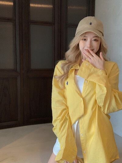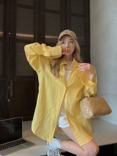 2024春夏トップス シャツ ボタン 襟 長袖 ゆったり 丈長め 細見え 夏 黄色 イエロー カジュアル おしゃれ かわいい シンプル 韓国ファッション レディース お出かけ