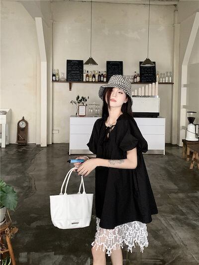 2024 春夏ワンピース 膝丈 レース Vネック 半袖 Aライン ゆったり 細見え 夏 黒 ブラック カジュアル おしゃれ かわいい キュート 韓国ファッション レディース お出かけ