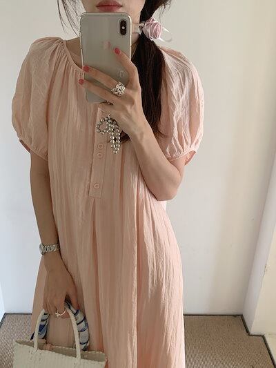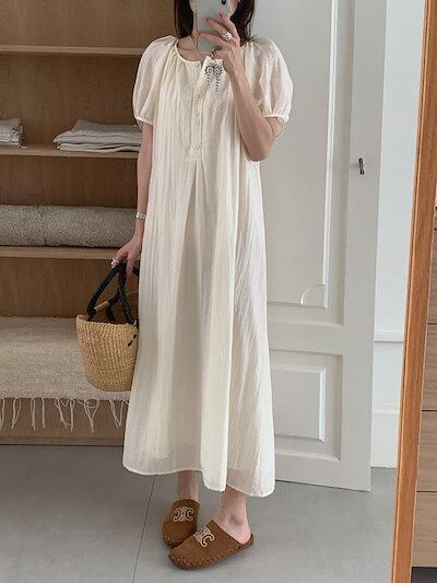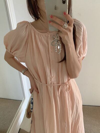 2024 春夏ワンピース ミモレ丈 半袖 バブル袖 ラウンドネック Aライン リボン ゆったり 細見え 夏 カジュアル おしゃれ かわいい キュート 韓国ファッション レディース お出かけ