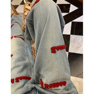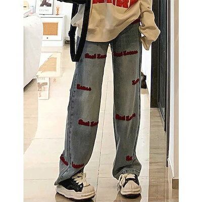 大きいサイズアメリカンレトロハイウエスト刺繍ジーンズ女性春秋ゆったり細ストレートワイドパンツ