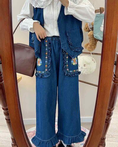 ワイドパンツ デニムパンツ レディース 大きいサイズ 裾フリル ジーンズ ボトムス ズボン パンツ ストレートパンツ 体型カバー 秋冬 九分丈 着痩せ ワイド デニム 花柄 刺繍 ウエストゴム お洒落
