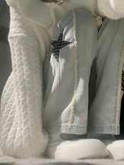 刺繍 ジーンズ レディース ハイウエスト ストレート ロングパンツ ヒップホップ おしゃれ ゆったり モップ ワイドパンツ