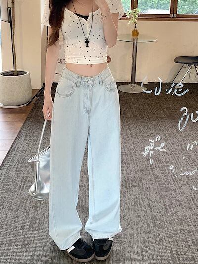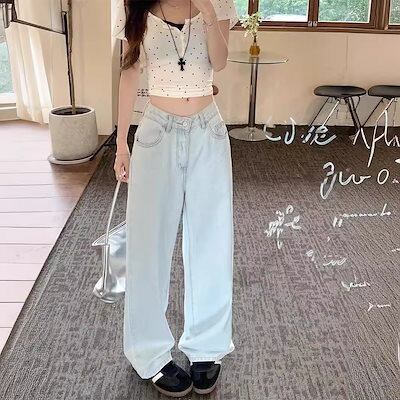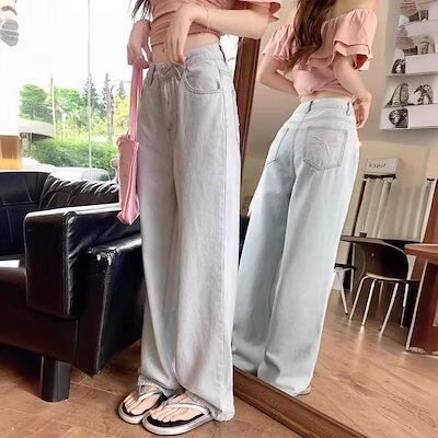 蝶刺繍ジーンズ レディース 2024夏 細身 小さめ ハイウエスト スリム ゆったり ストレート ワイドパンツ