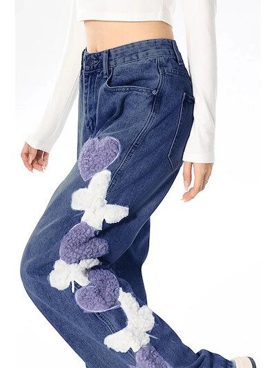 蝶の愛の刺繍入り女性用ブルージーンズ ハイウエスト ルーズストレート カジュアル ワイドレッグ ロングパンツ1763